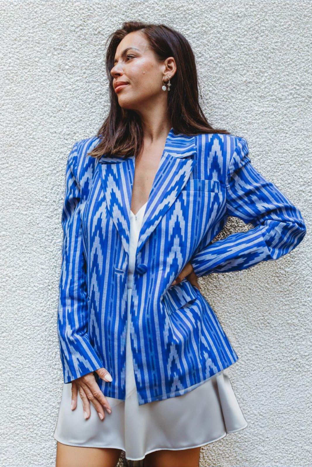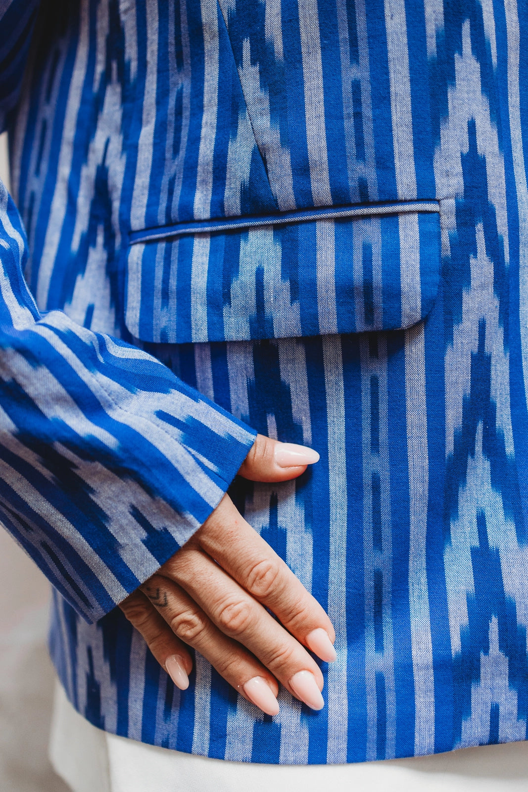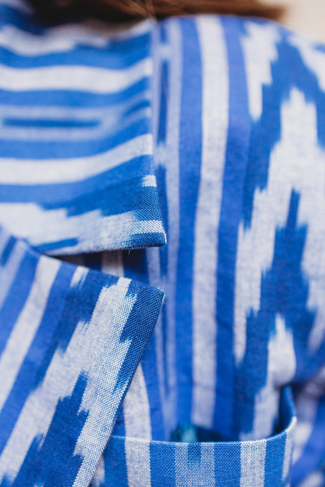The stunning Aliyah blazer is a beautiful handwoven creation by master weavers, and has been skillfully stitched by our team of female artisans from India. Made from 100% handloom cotton with a viscose lining. The fit is oversized and the fabric is lightweight.