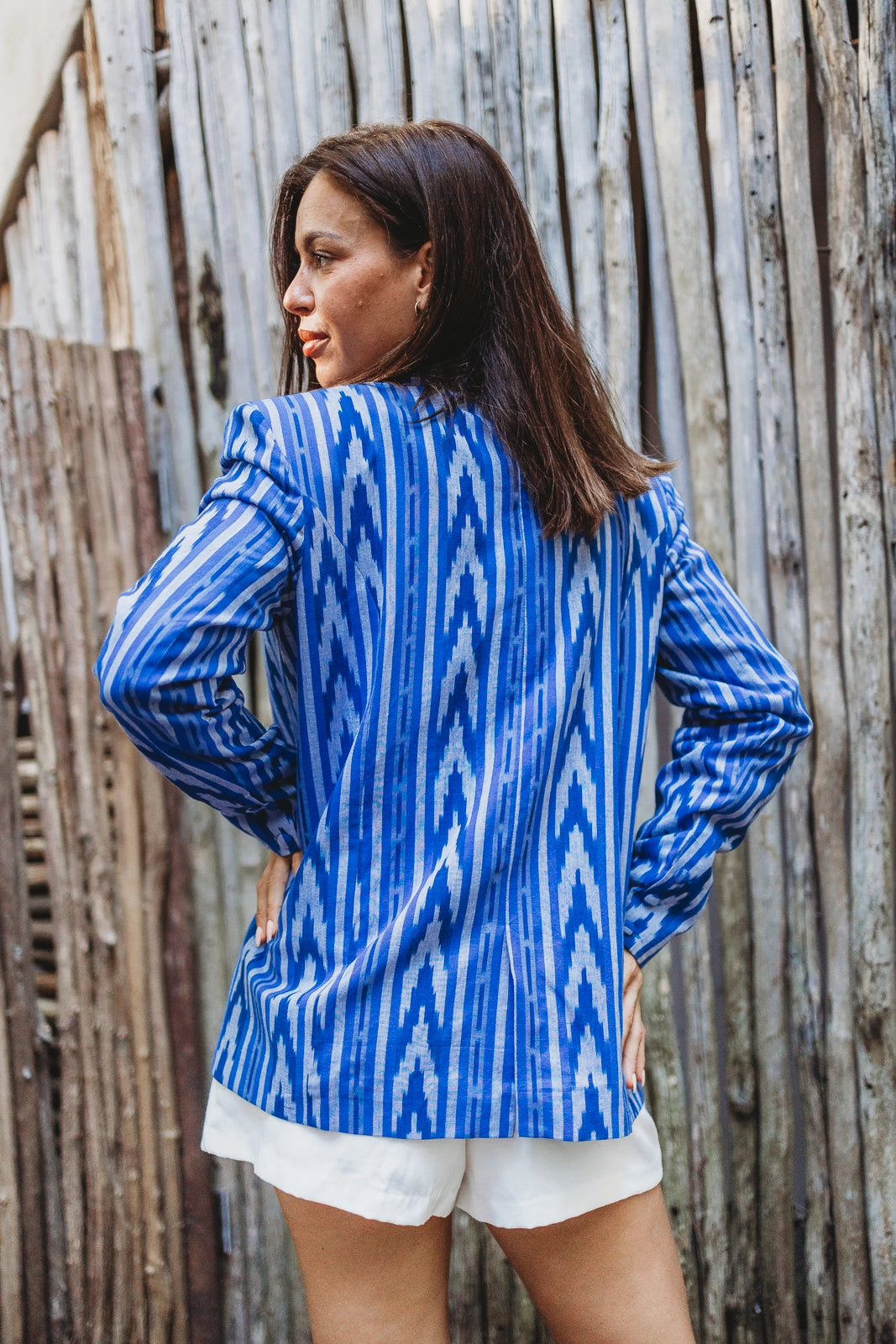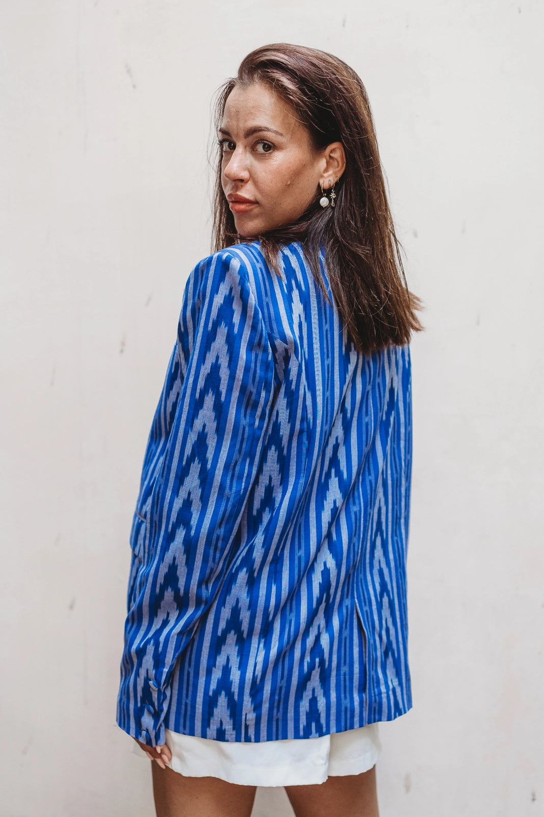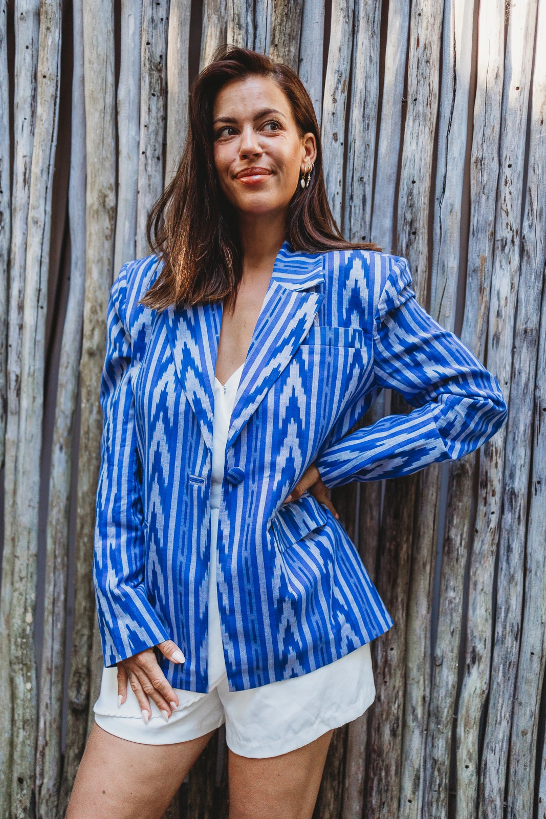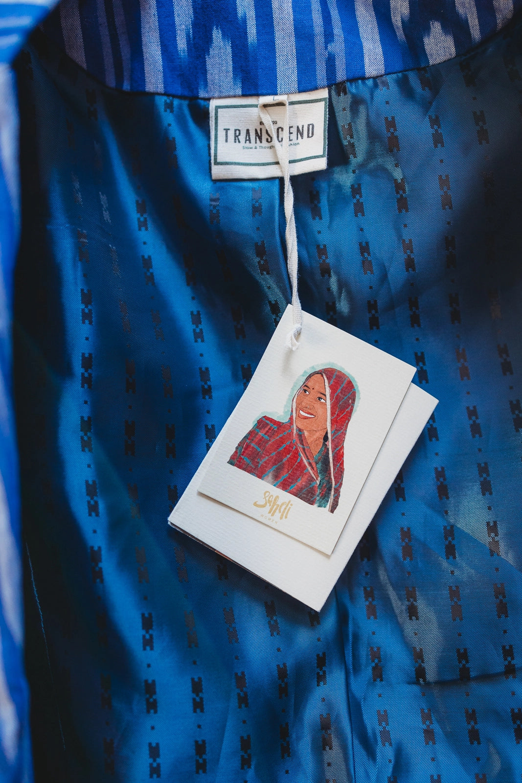 The stunning Aliyah blazer is a beautiful handwoven creation by master weavers, and has been skillfully stitched by our team of female artisans from India. Made from 100% handloom cotton with a viscose lining. The fit is oversized and the fabric is lightweight.