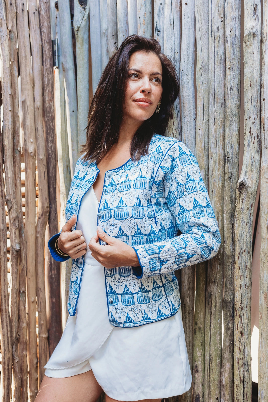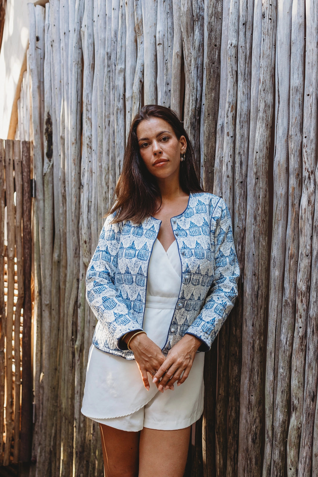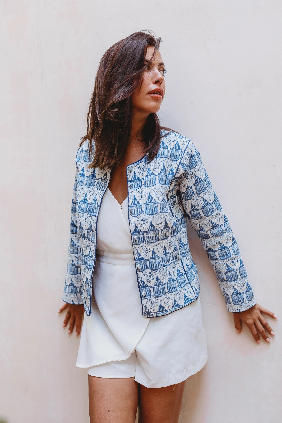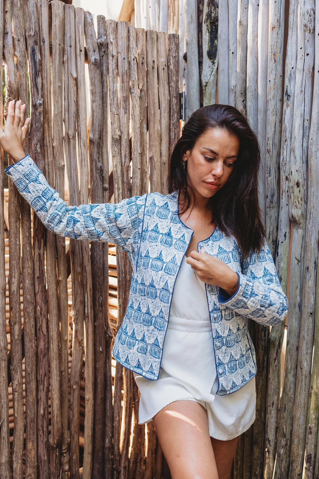 Inaya is a lightweight quilted jacket to stay cozy on the go. The gorgeous water chestnut block print is unique and refreshing. The jacket is block-printed by hand and sewn by all female artisan team who are paid living wages.