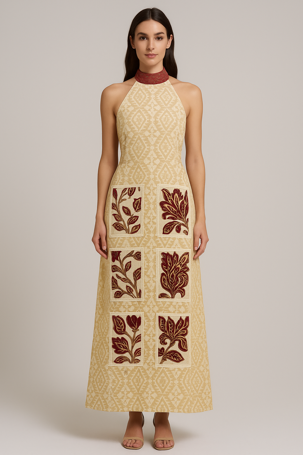Modern simplicity meets storied textile in this 1960s-inspired halter gown. The Columbia gown features a clean, backless silhouette with a high halter neckline that ties gracefully behind the neck. Soft pleating at each side adds movement to the full-length skirt, cut from a lightweight linen in pale yellow - a rare deadstock find donated through a local fabric drive. Originally woven and embroidered in India, the fabric features delicate geometric threadwork, celebrating artisan textile traditions.
