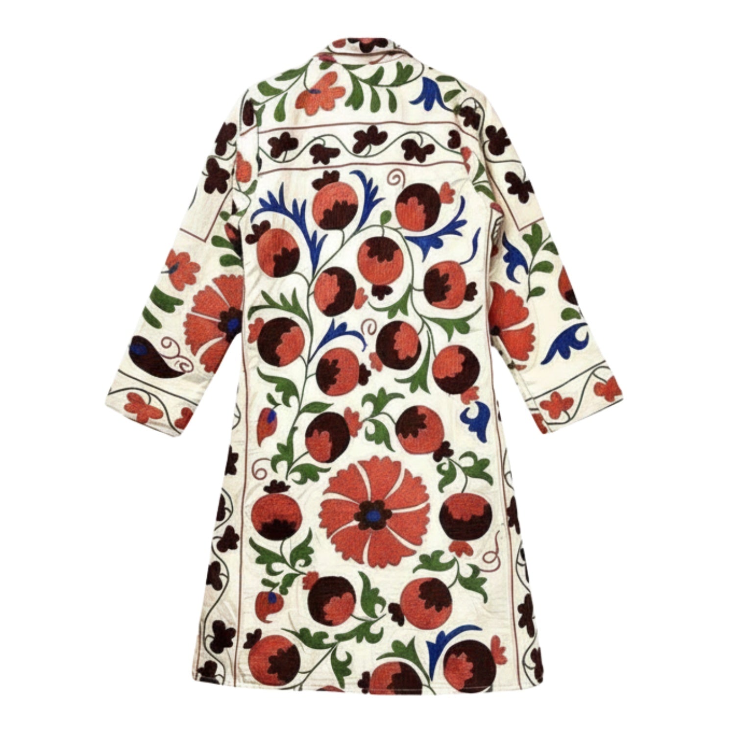 - Authentic Suzani Technique: Each Gul coat is a testament to heritage, meticulously hand-embroidered by skilled artisans from Uzbekistan using the traditional Suzani technique indigenous to the region.