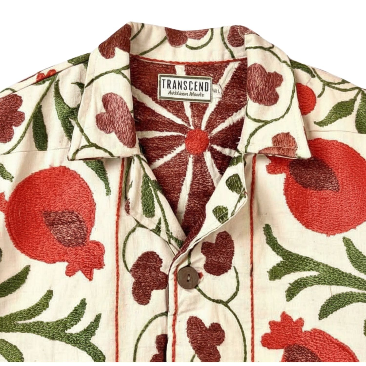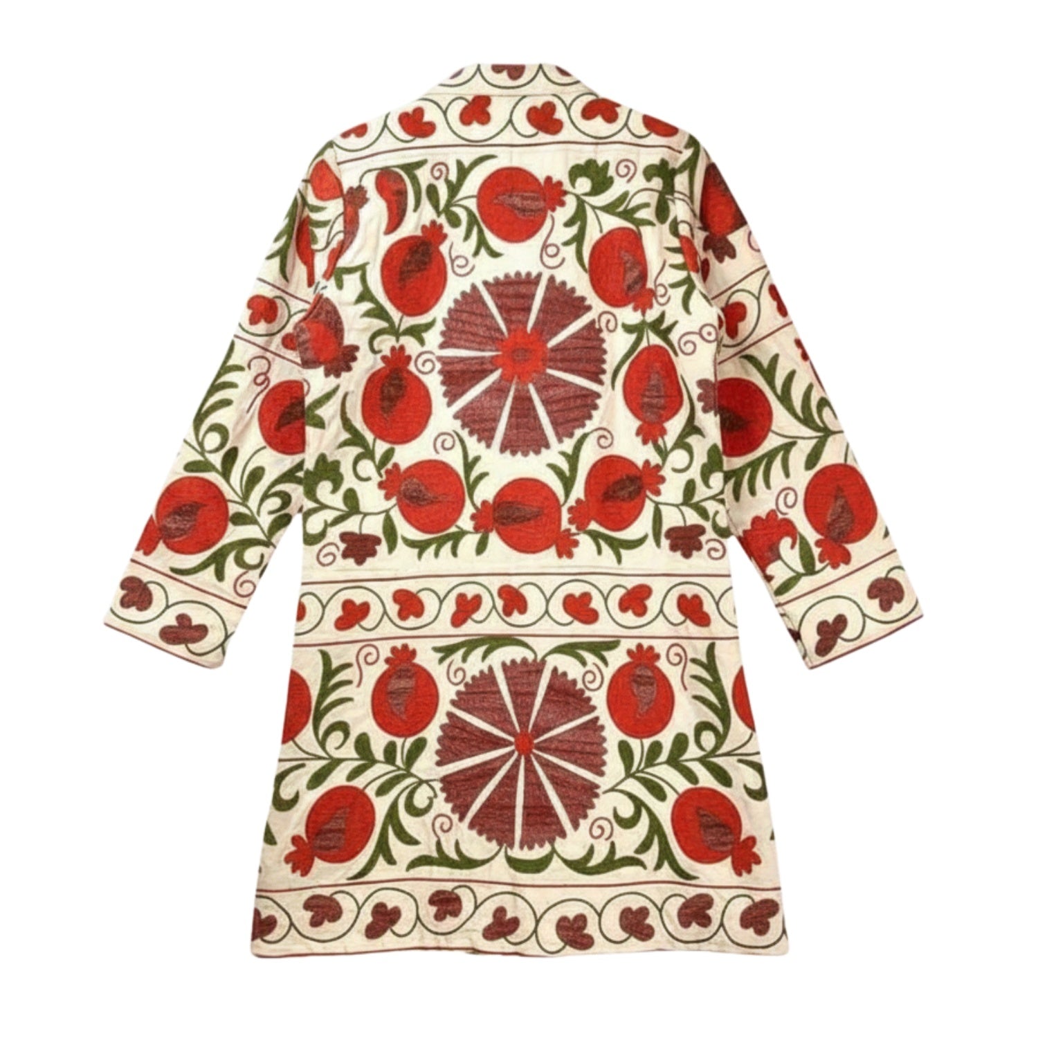 Embrace the vibrant red and green floral motifs that stand out against the cream background, showcasing the rich textile heritage of Central Asia. The relaxed fit and distinctive pattern make this coat a striking addition to any wardrobe.