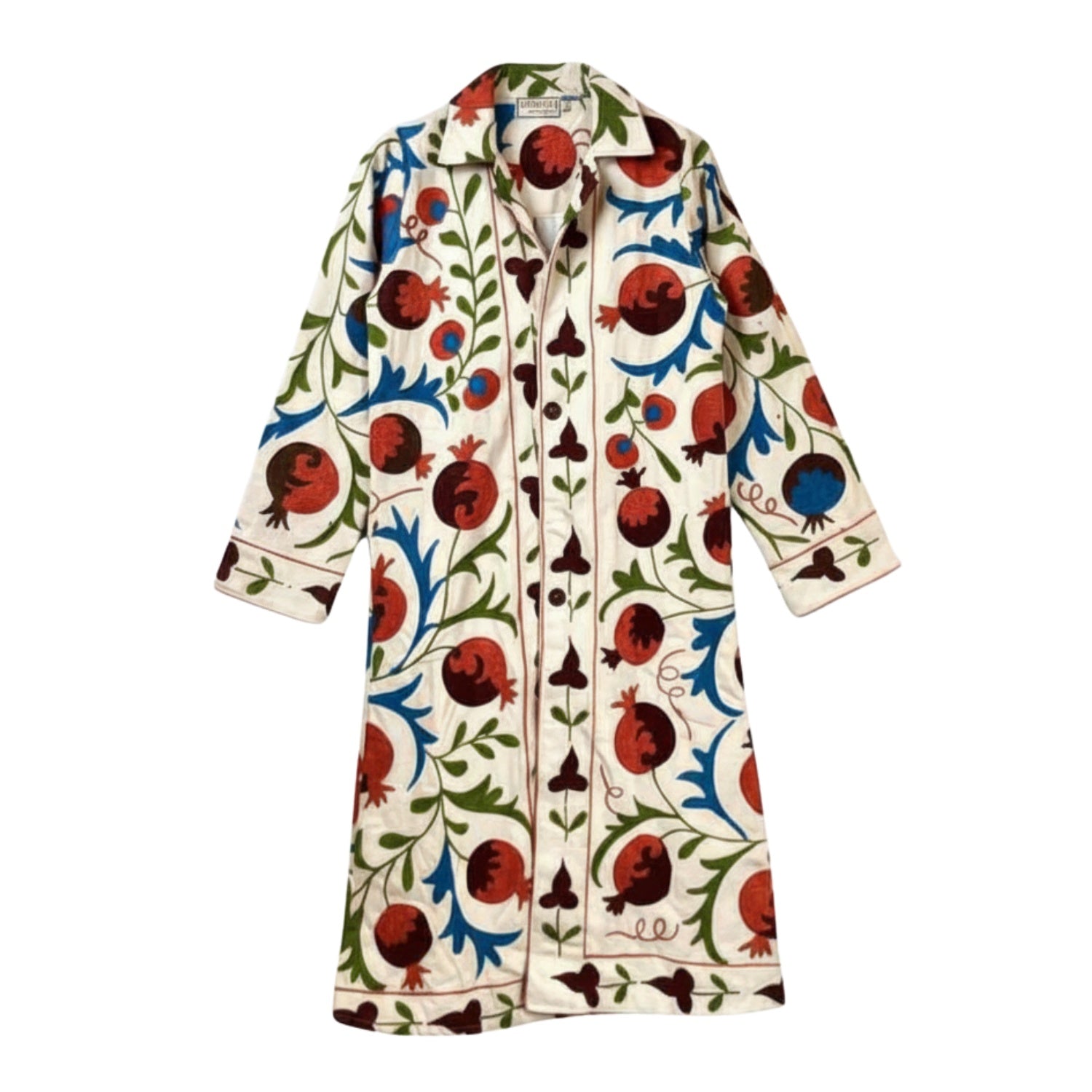 Embrace vibrant culture and traditional craftsmanship with "The Wild Fig Bloom" coat, a stunning piece of wearable art. The design features bold, oversized floral and pomegranate motifs in rich hues of terracotta, deep plum, and emerald green against a natural off-white base. Pomegranates are traditional symbols of fertility, health, and good luck in Suzani art.