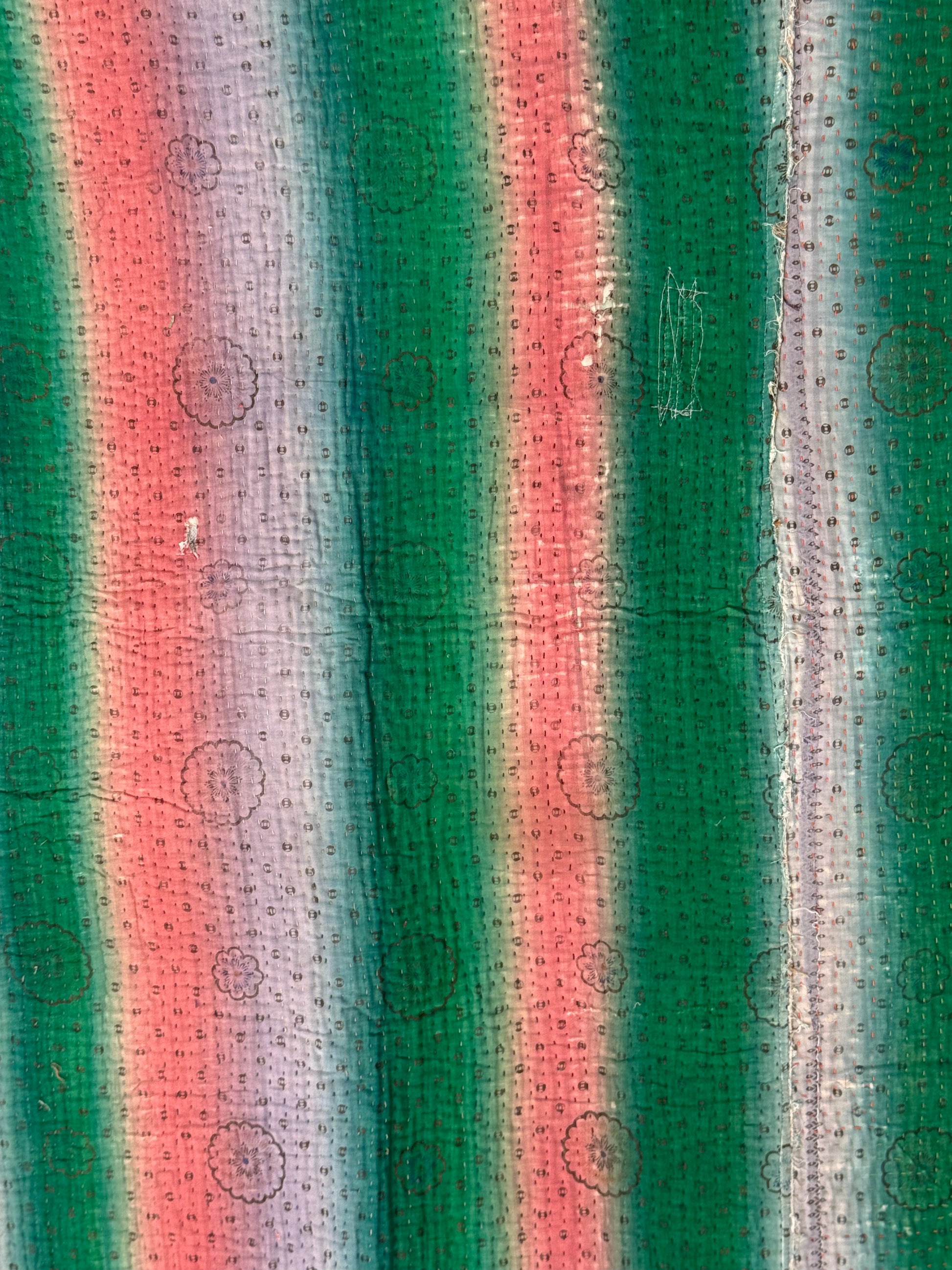 The Marigold Path Vintage Kantha Throw is a reversible Kantha throw hand-stitched from 100% upcycled cotton saris by women artisans in Eastern India. These vintage fabrics feature delicate Kantha embroidery and patterns that vary from side to side. Minor wear, fading, and mended sections are part of the fabric’s story, celebrating its age and authenticity. Photos include distressed areas when possible.