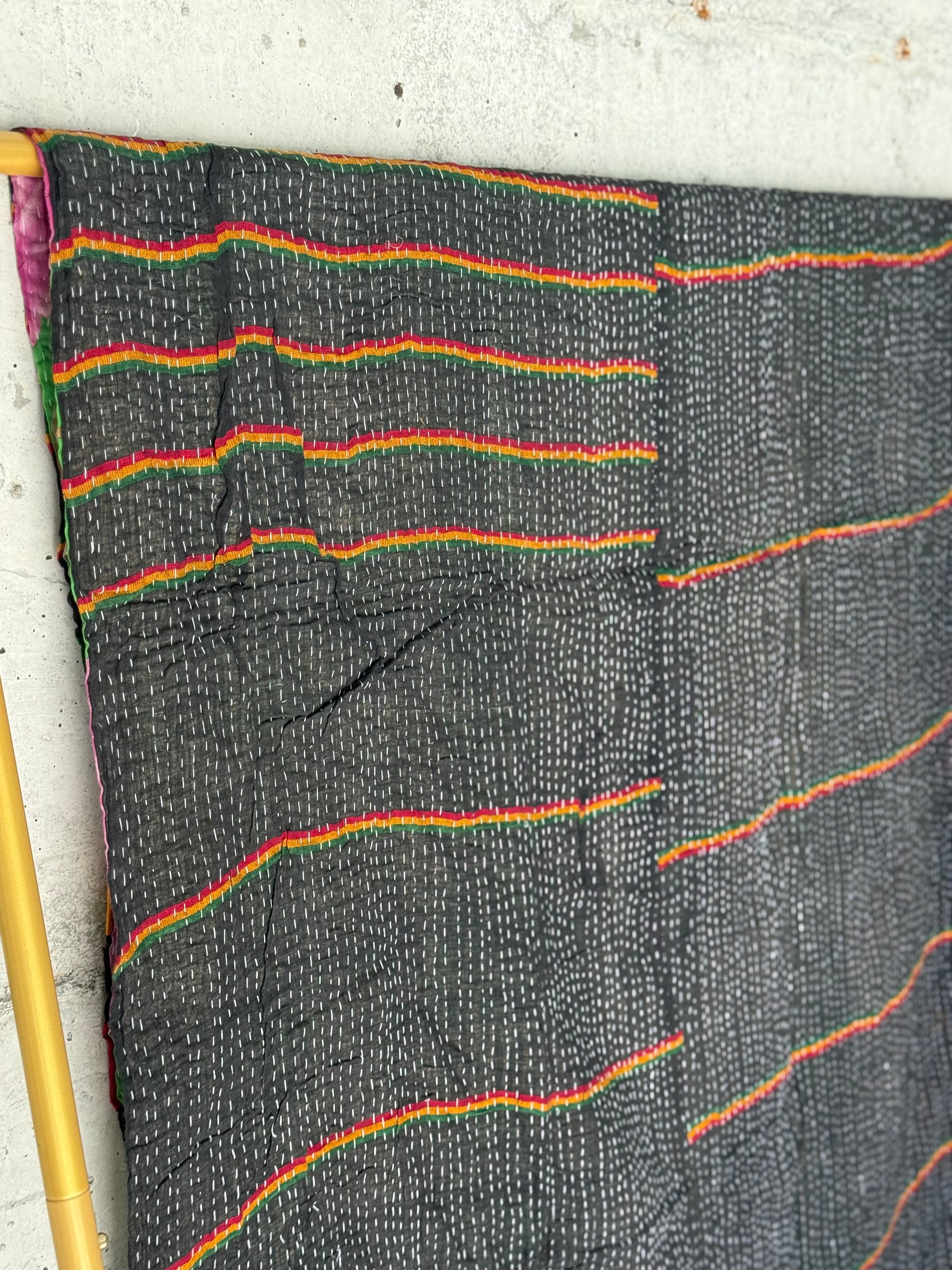 The Roses and Thorns Vintage Kantha Throw is a reversible Kantha throw hand-stitched from 100% upcycled cotton saris by women artisans in Eastern India. These vintage fabrics feature delicate Kantha embroidery and patterns that vary from side to side. Minor wear, fading, and mended sections are part of the fabric’s story, celebrating its age and authenticity. Photos include distressed areas when possible.