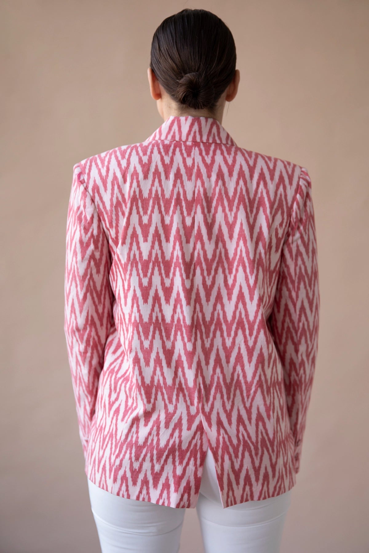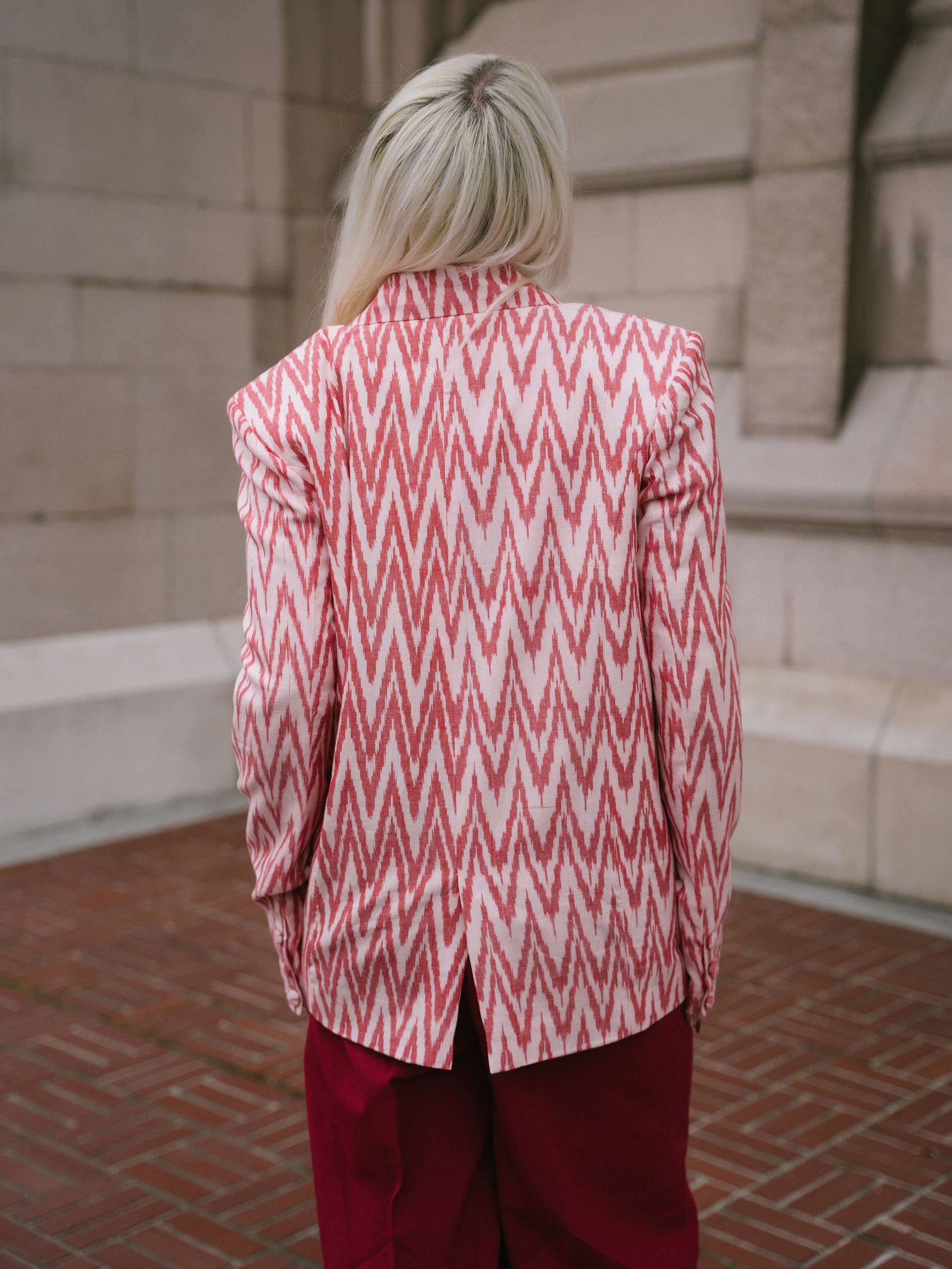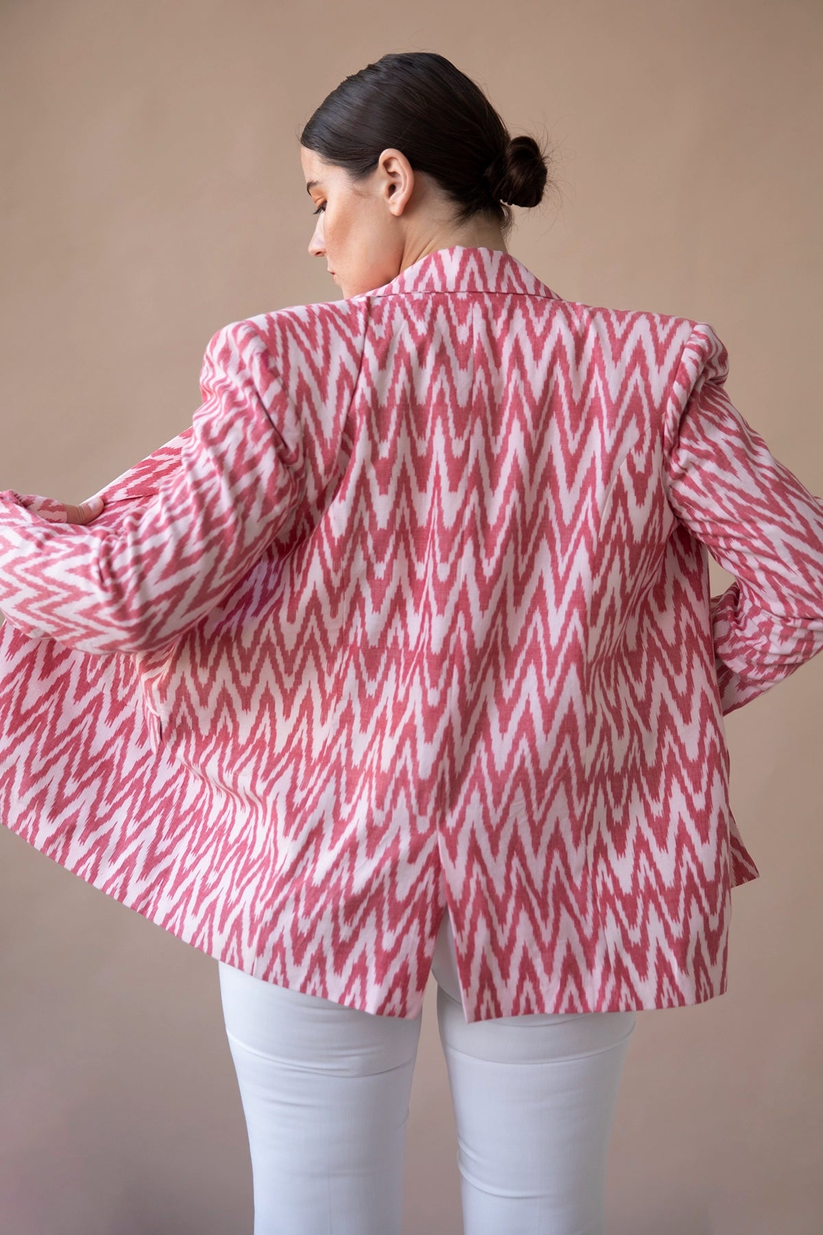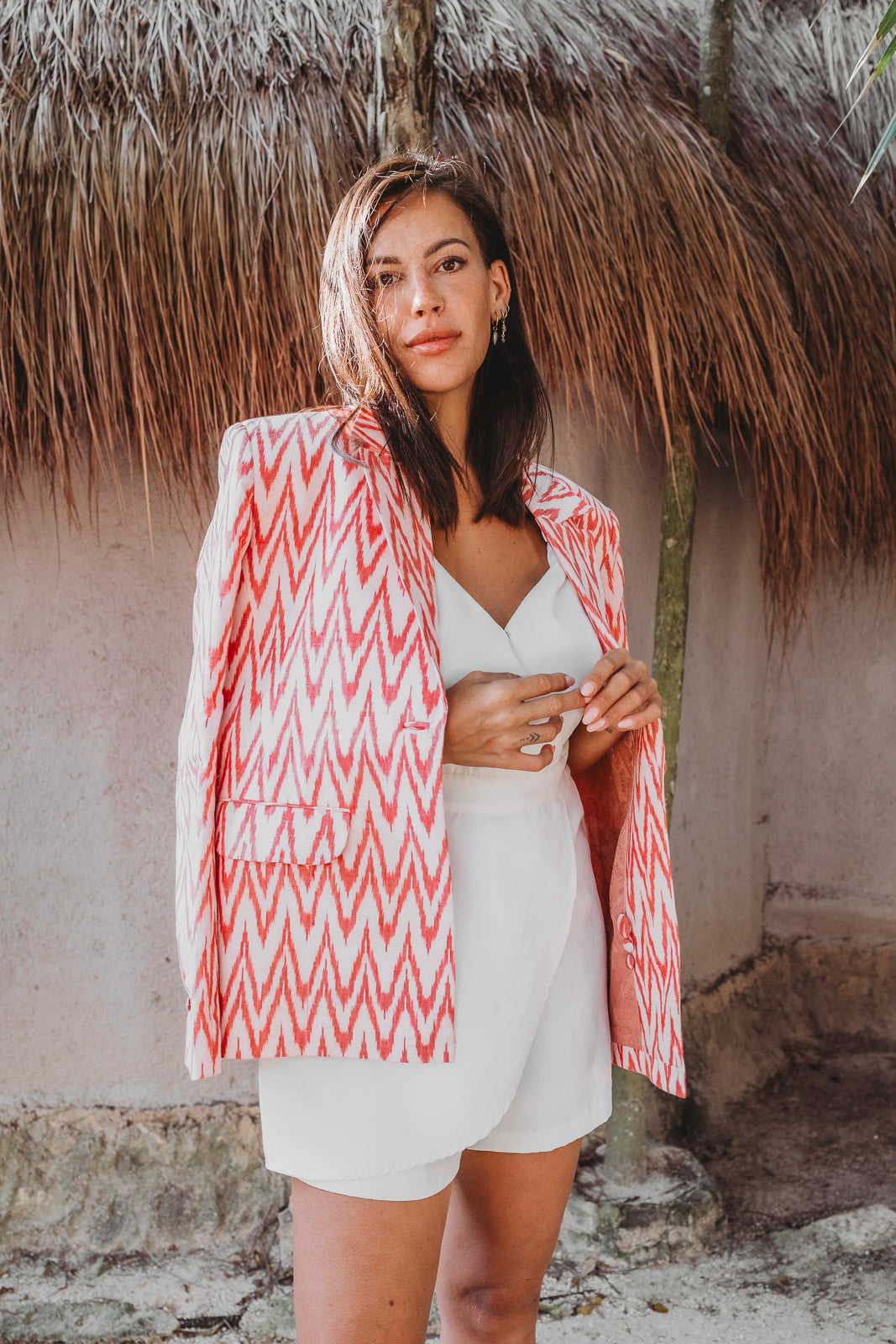 Amira blazer is made using a cotton fabric, hand-woven using the Ikat technique to create perfectly symmetrical patterns in a gorgeous coral color. The blazer has padded shoulders to create strong shoulders. She has a relaxed fit and is super lightweight.