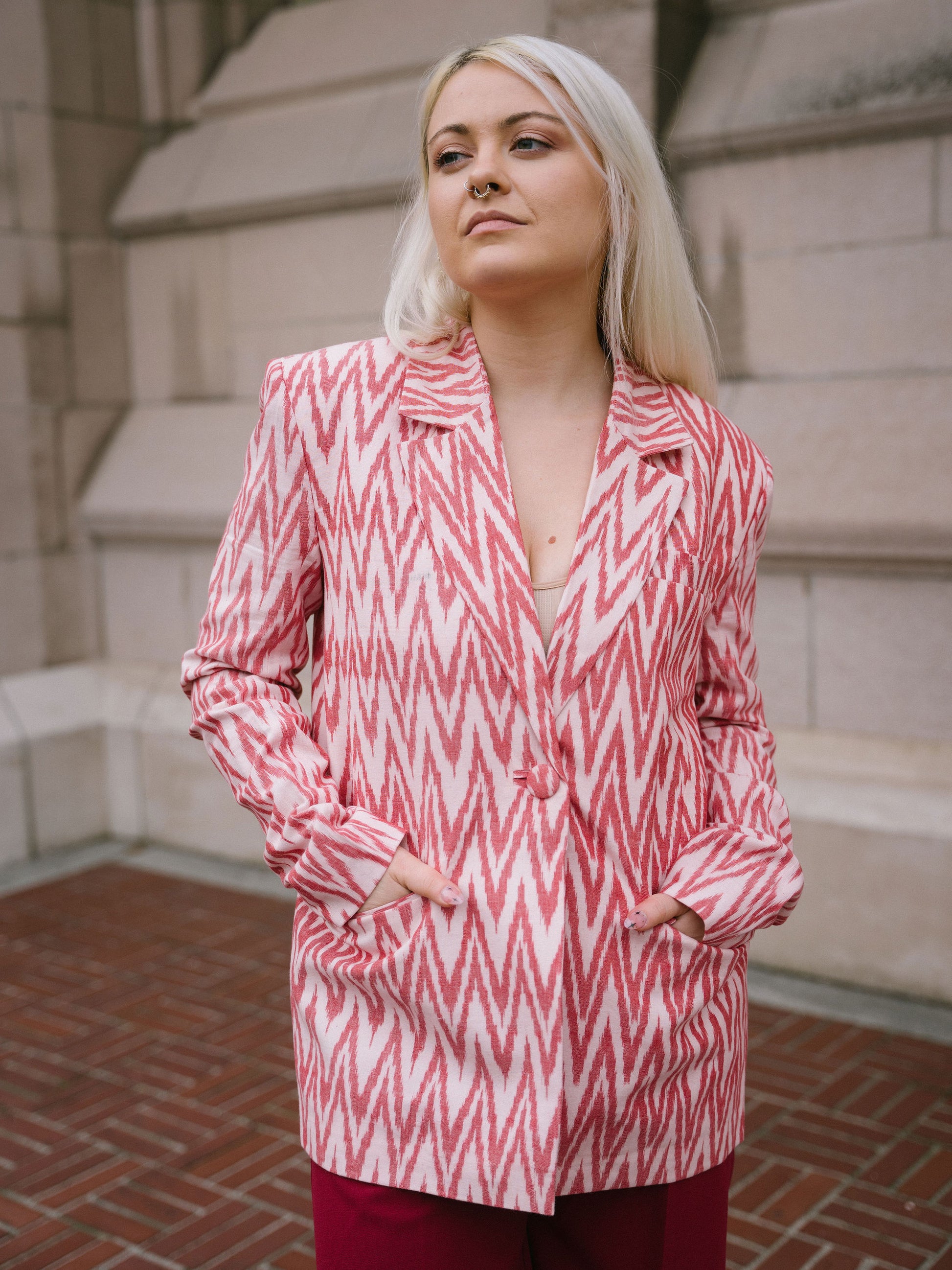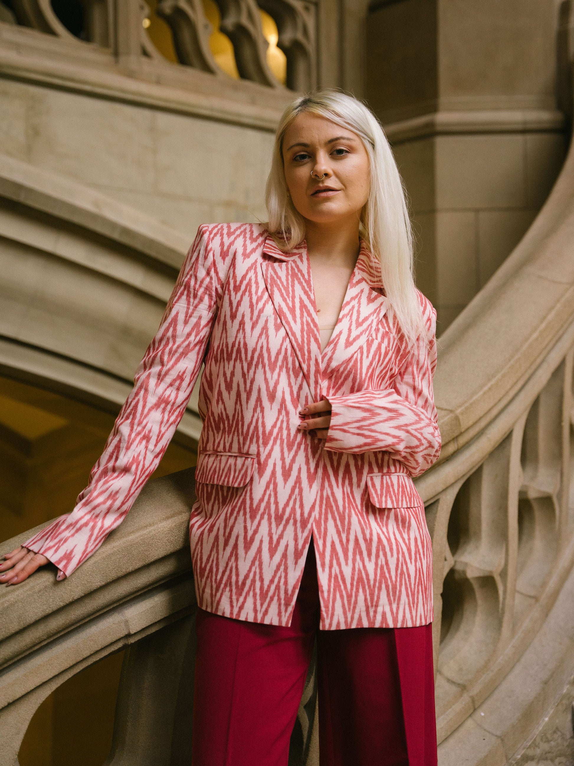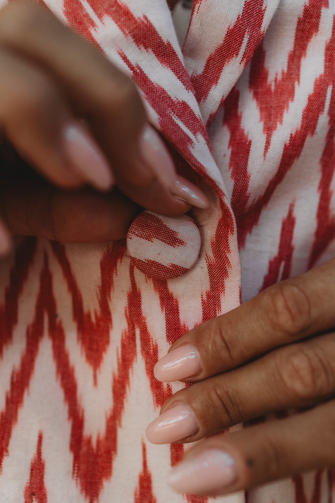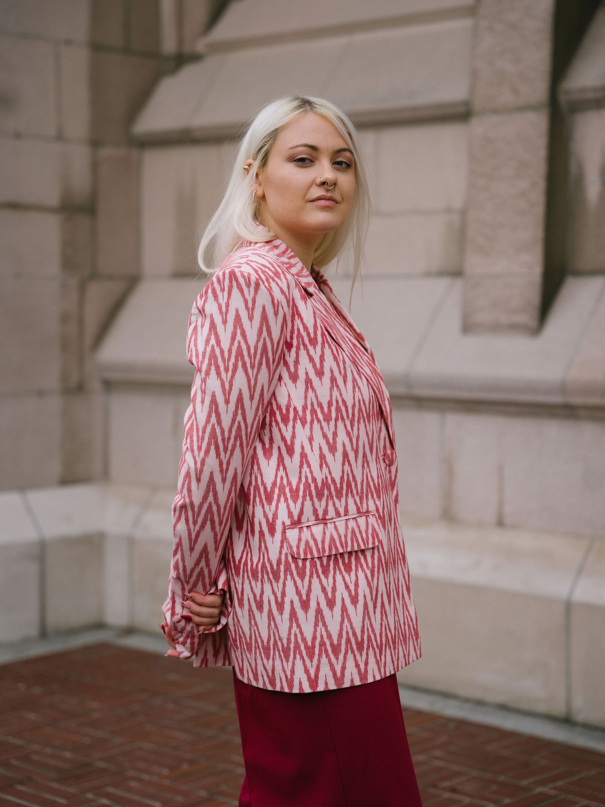 Amira blazer is made using a cotton fabric, hand-woven using the Ikat technique to create perfectly symmetrical patterns in a gorgeous coral color. The blazer has padded shoulders to create strong shoulders. She has a relaxed fit and is super lightweight.