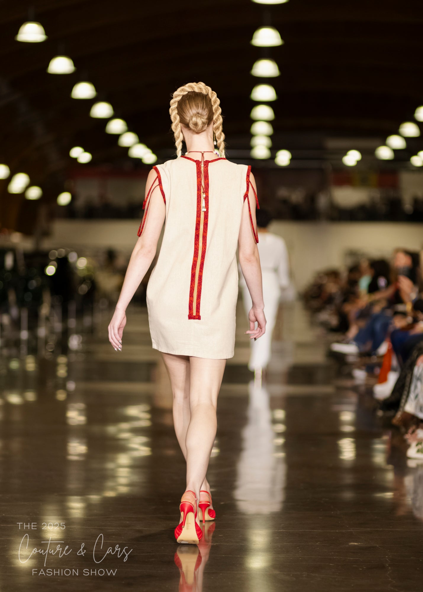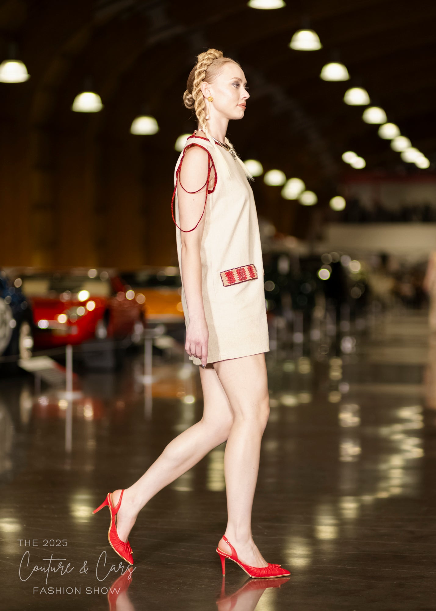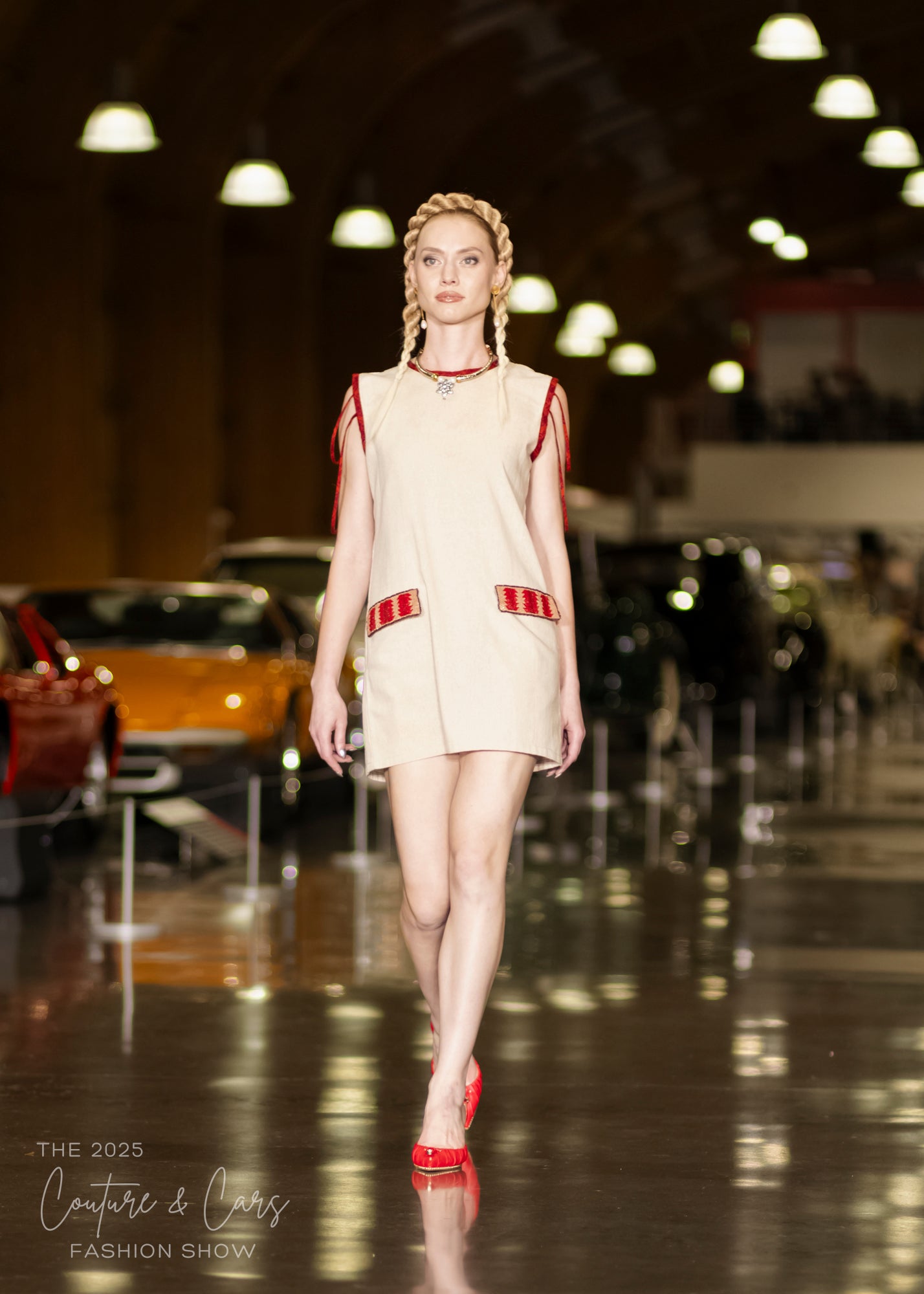 Every bead is intentionally placed, making each Salish Dress a one-of-a-kind piece that honors craftsmanship and cultural storytelling. The deep red trim and vintage zipper piping nod to reclaimed heritage materials, while the dress’s clean silhouette highlights the beadwork as the central narrative.